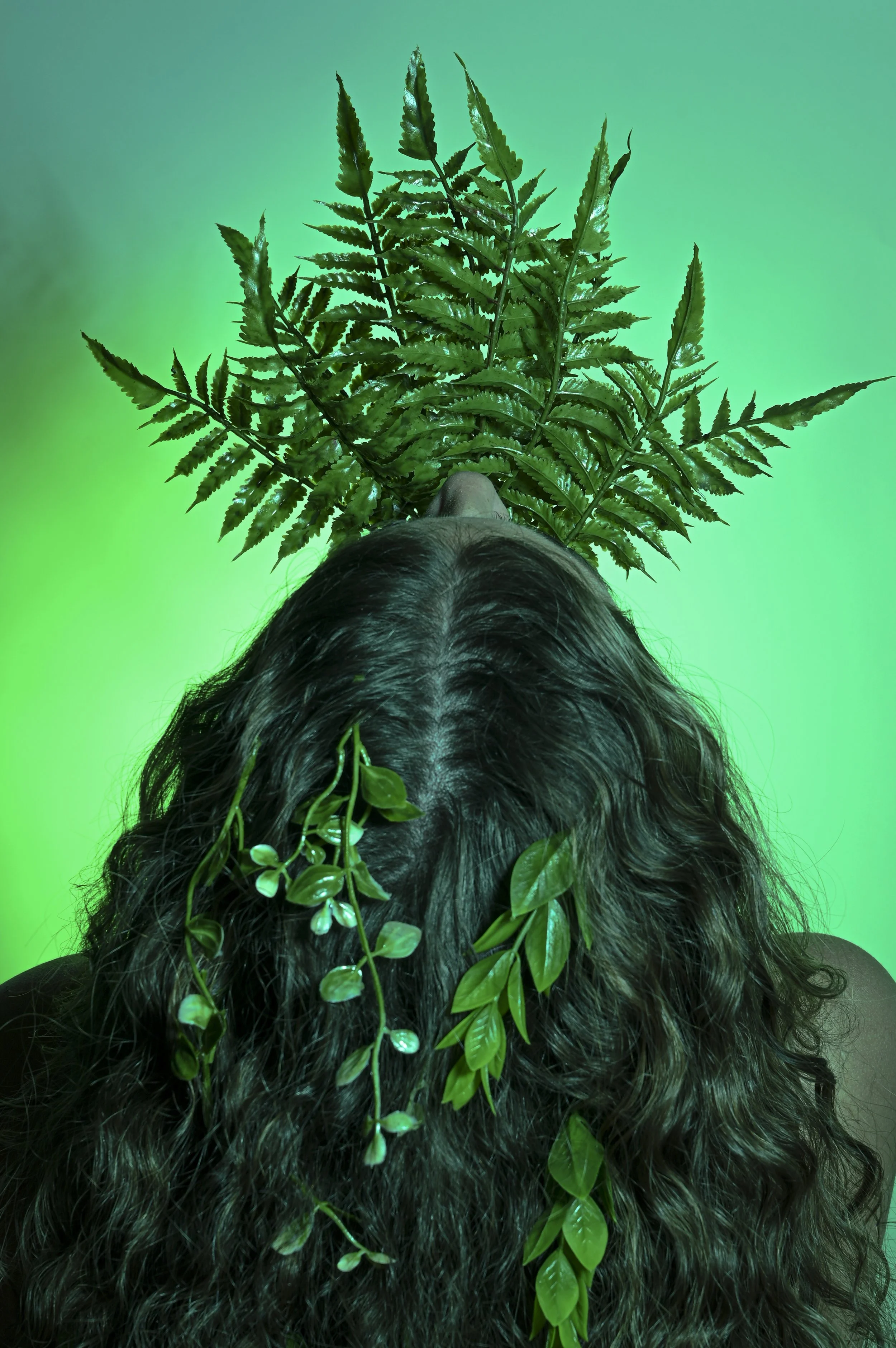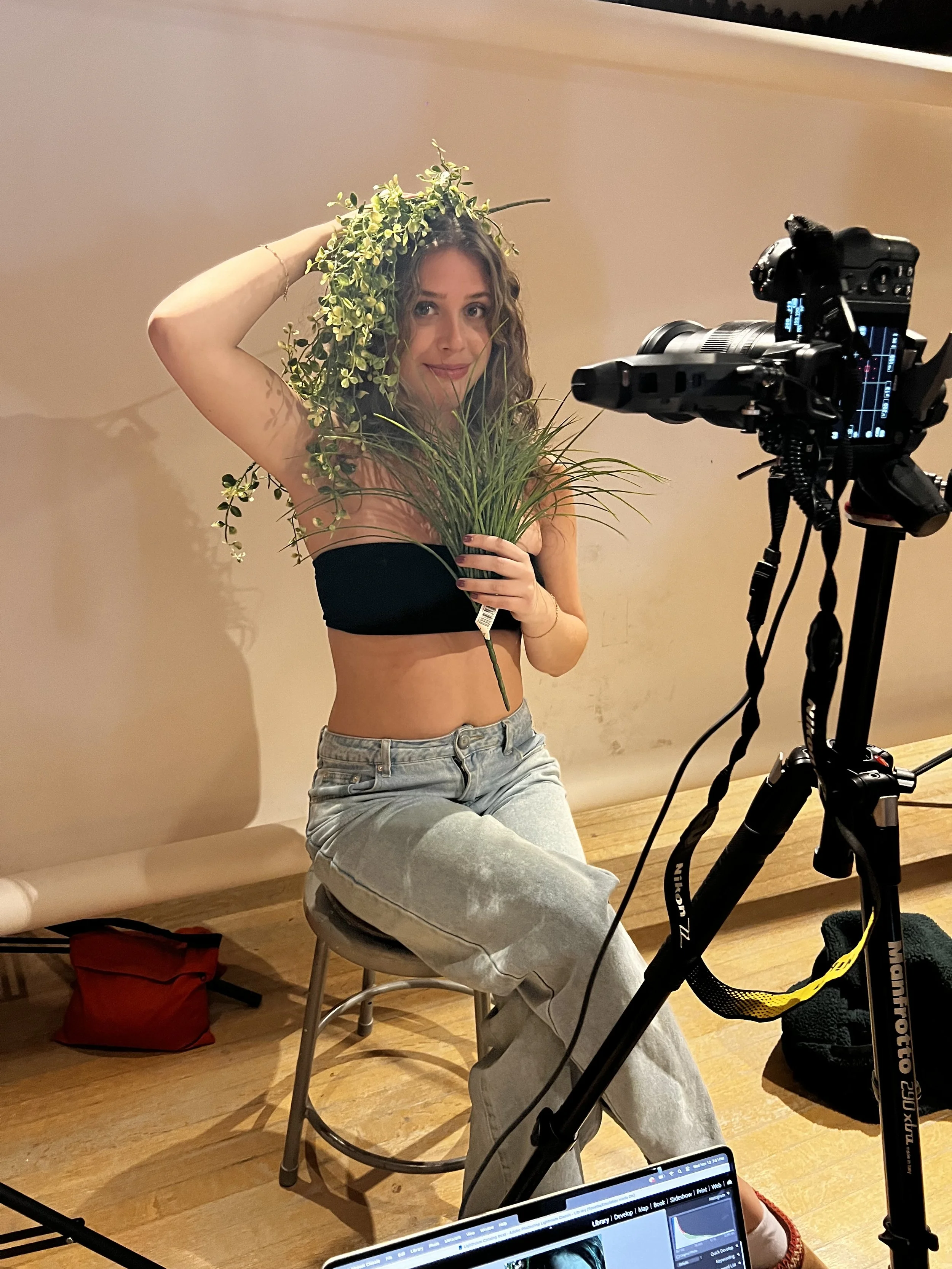 The photo of my model facing away from the camera is something I didn’t end up using in my final project. I had envisioned plants growing out of my model’s mouth and intertwined in her hair, as if they had naturally taken root. Unfortunately, when I went to execute this idea, nothing came together. The fake plants looked obviously fake, they wouldn’t stay in place, and the green gels cast an unflattering, almost alien glow. In the end, I scrapped this attempt and did a complete reshoot, which allowed me to create an image I truly loved and included in the final collection.